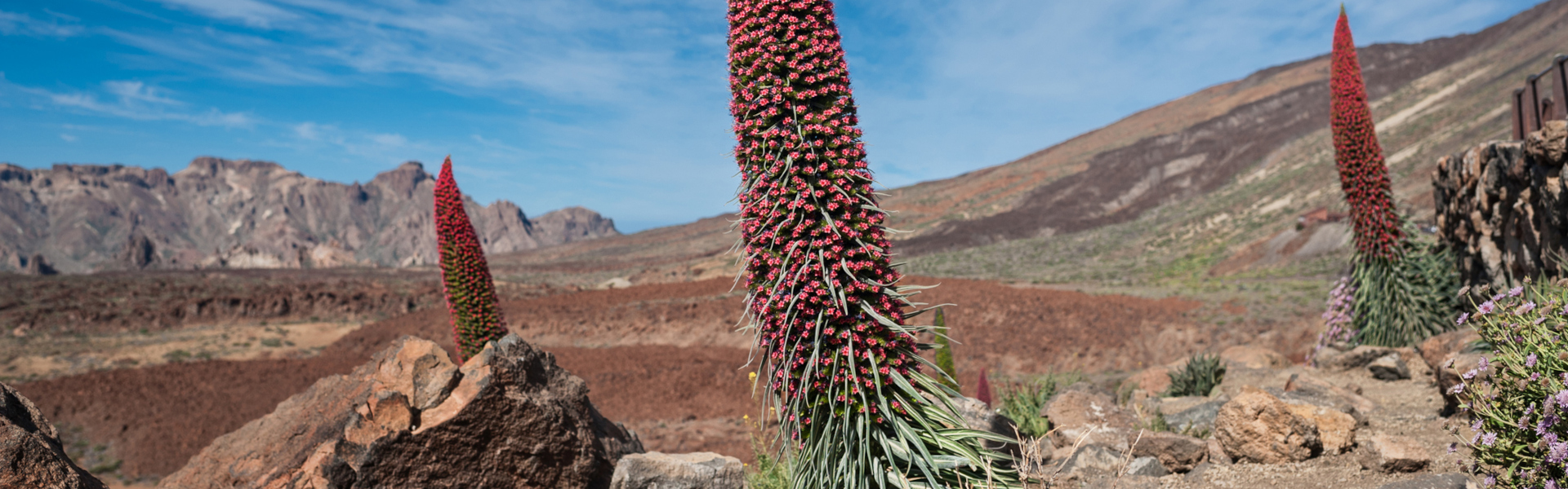 El tajinaste rojo es una planta canaria que desarrolla espectaculares varas cubiertas de cientos de menudas florecillas. En esta época del año, como farolas rojas, marcan el paisaje volcánico apuntando al cielo con sus flores.
