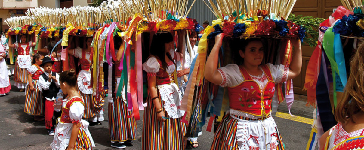 Cerca del monumento religioso, los hombres acuden con los cestos al encuentro de las proveedoras, que son las mujeres solteras que sostienen sobre sus cabezas grandes cestas adornadas con cintas de colores. Dentro llevan bollos con cañas repletas de pequeñas figuritas. Una vez terminado el recorrido, los cestos se colocan en la fachada de la Iglesia hasta que finalizan los festejos.