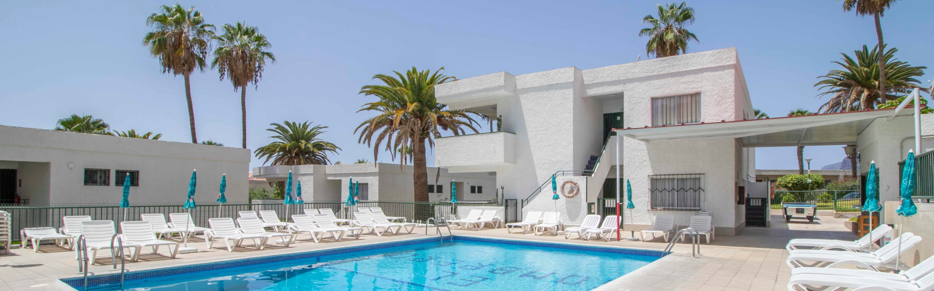 Complejo de amplios apartamentos con vistas al mar en Los Gigantes con piscinas para adultos y otra para niños, amplias zonas de jardín.