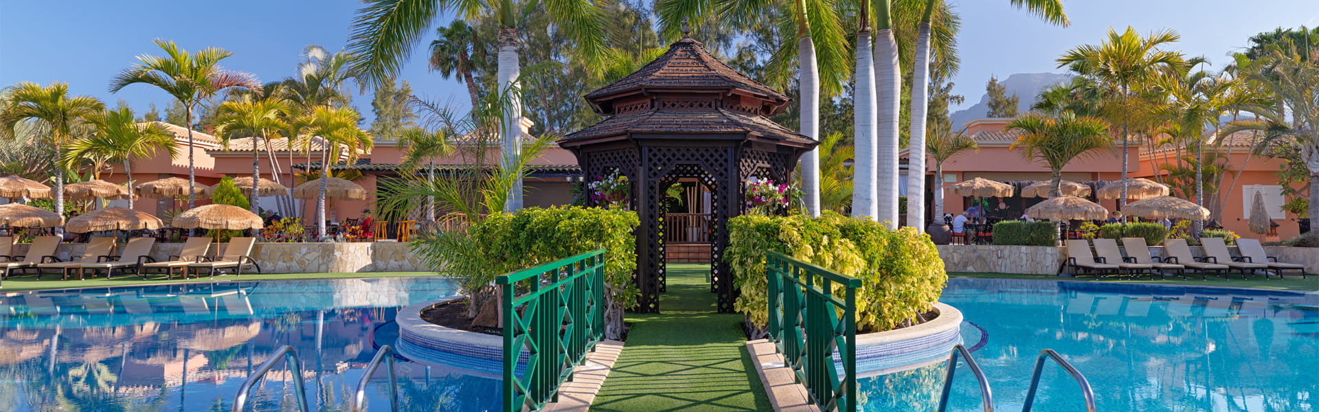 Green Garden Resort es un complejo de estilo colonial situado junto a la Casa Club de Golf Las Américas, rodeado por la calle del hoyo 6 y en medio de unos maravillosos jardines tropicales, en los que destaca una gran colección de majestuosas palmeras reales. Construido en una y dos alturas, Green  Garden Resort dispone de 121 apartamentos de uno y dos dormitorios, perfectamente equipados y decorados, con salón/comedor, baño, cocina con (placa vitrocerámica, horno, tostadora, cafetera eléctrica etc.) televisión, teléfono y balcón o terraza.