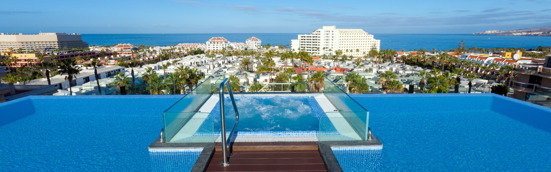 Además, su espectacular rooftop ofrece unas vistas inmejorables de Playa de las Américas. Destaca el Café del Mar, así como su piscina infinity, hidromasaje, solárium, zonas nudista y VIP, para disfrutar de momentos inolvidables bajo el sol.