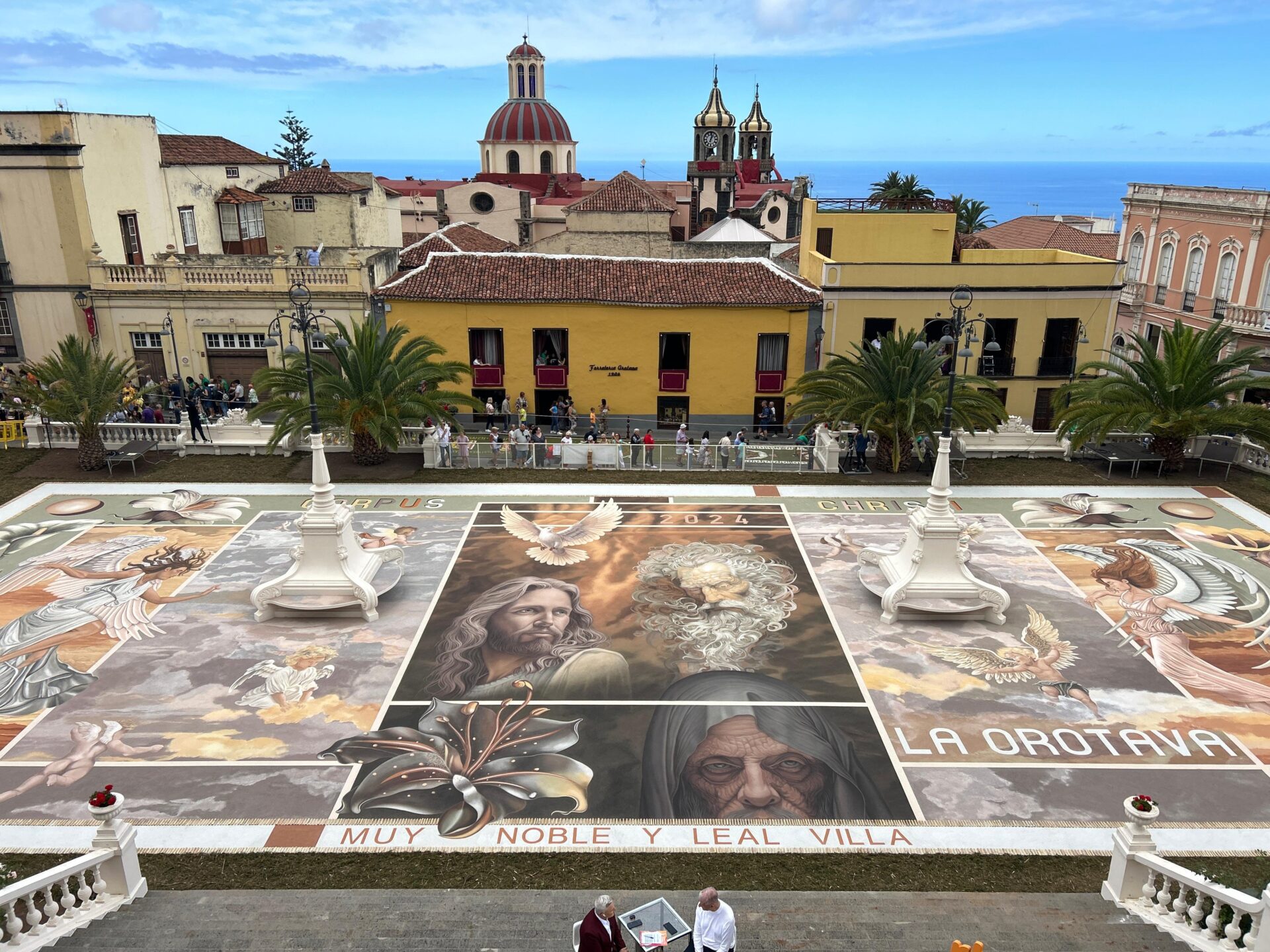 - La obra maestra: en la plaza del ayuntamiento de La Orotava se elabora un tapiz gigante utilizando arenas volcánicas naturales de todos los colores, traídas directamente del Parque Nacional del Teide.