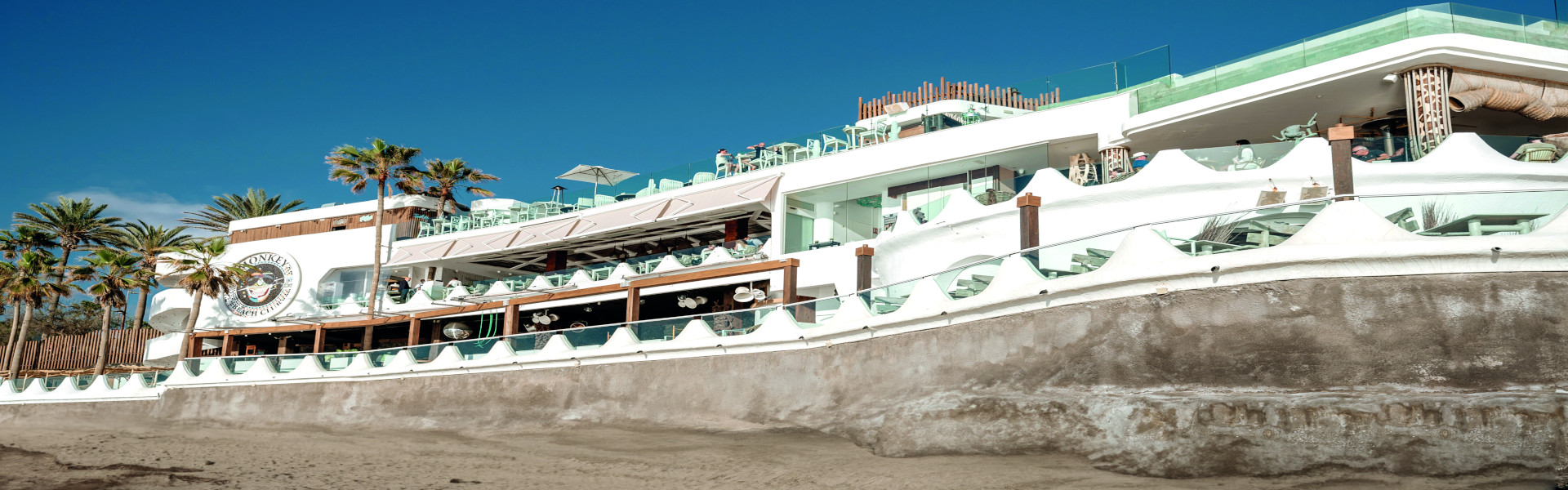 Monkey Beach Club es uno de los espacios singulares y emblemáticos de Tenerife. Situado sobre la Playa de Troya, tiene una de las vistas más bonitas de La Gomera desde Tenerife. El local dispone de varios espacios diferenciados en sus tres plantas.
